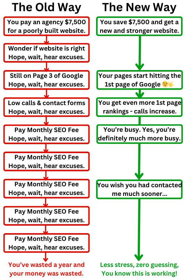 And (2) it takes a few months for SEO to kick in on your new site. So I don’t mind eating the cost of a new website to lower your risk of entry in working with me. I share the burden and risk with you – you’ll thank me for it and it builds trust!